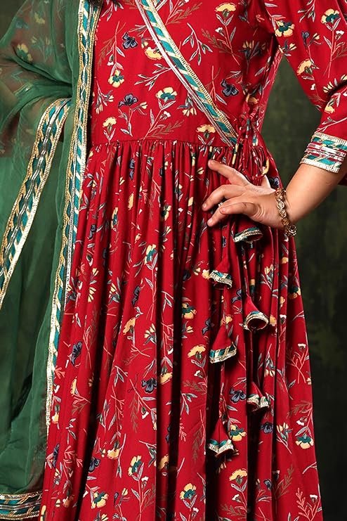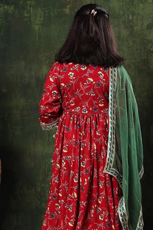 Girls Rayon Floral Print Drawstring 3/4 Sleeve Anarkali Dress With Churidar Payjama and Dupatta, Red