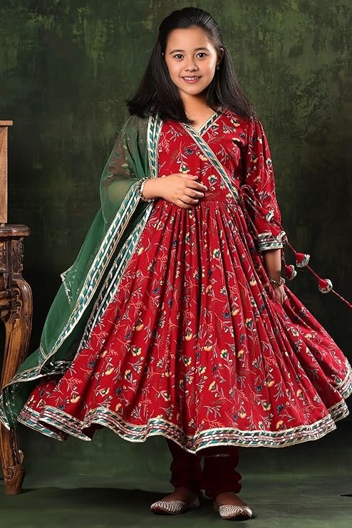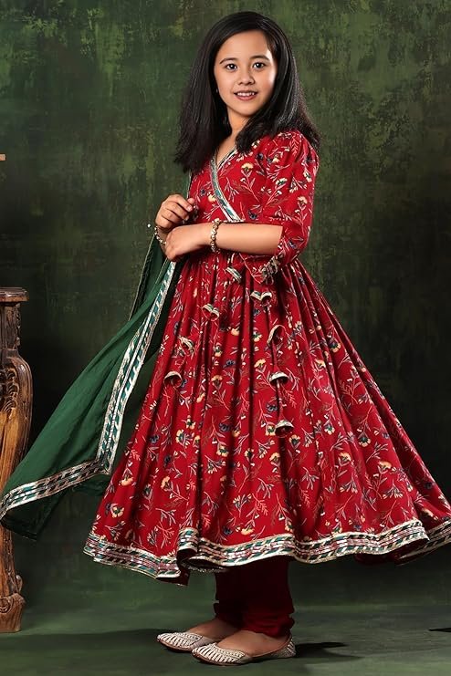 Be the first to review “Girls Rayon Floral Print Drawstring 3/4 Sleeve Anarkali Dress With Churidar Payjama and Dupatta, Red”
